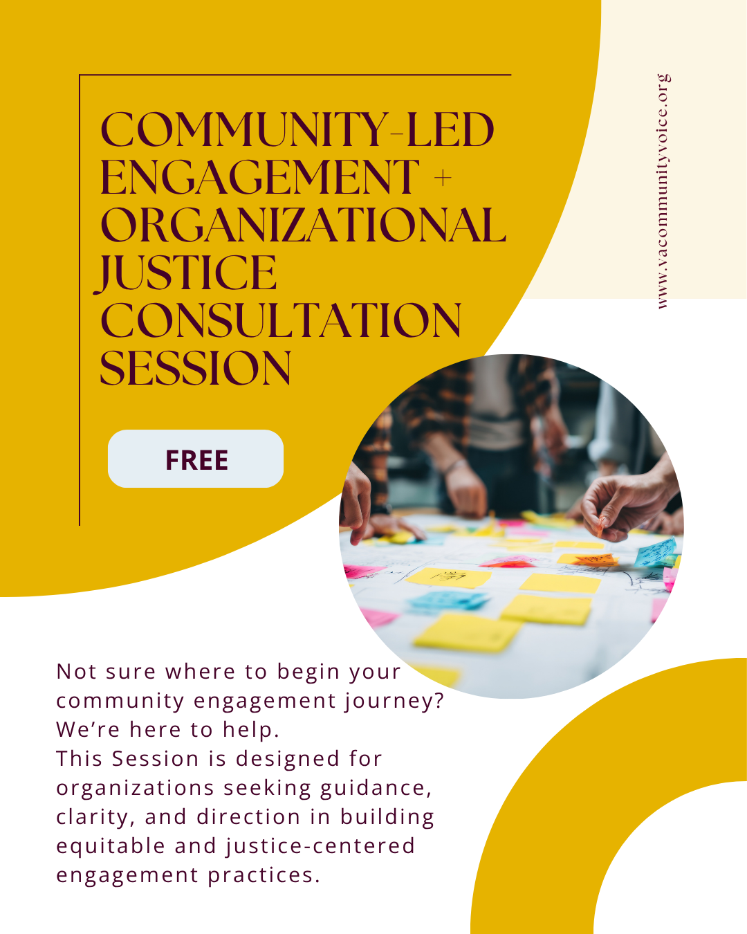 Our Community-Led Engagement + Organizational Justice Consultation Session is designed for organizations seeking guidance, clarity, and direction in building equitable and justice-centered engagement practices. Whether you're just starting out or looking to refine your current strategies, our Director of Equity Improvement is available to answer your questions, explore your goals, and help you navigate the services and supports that best fit your needs.