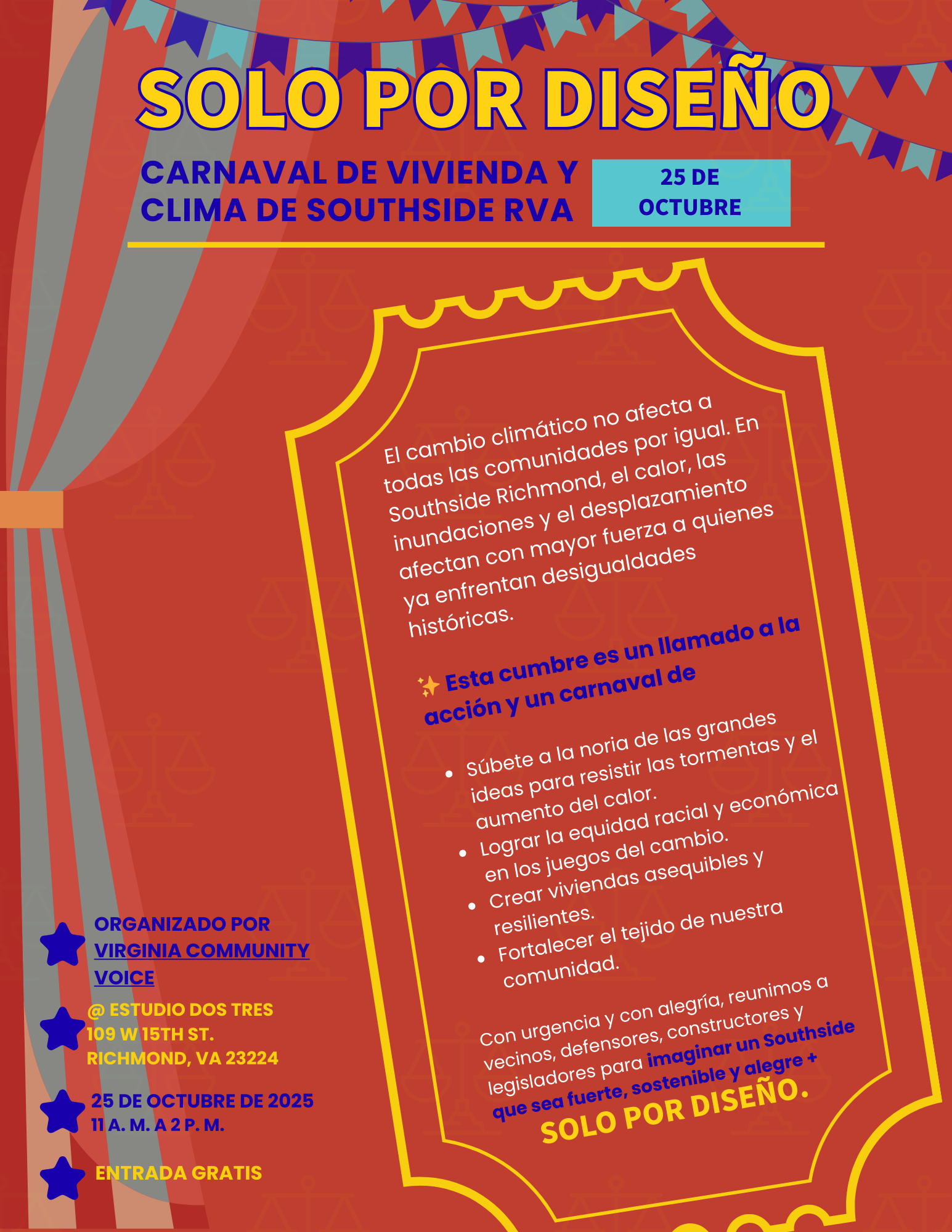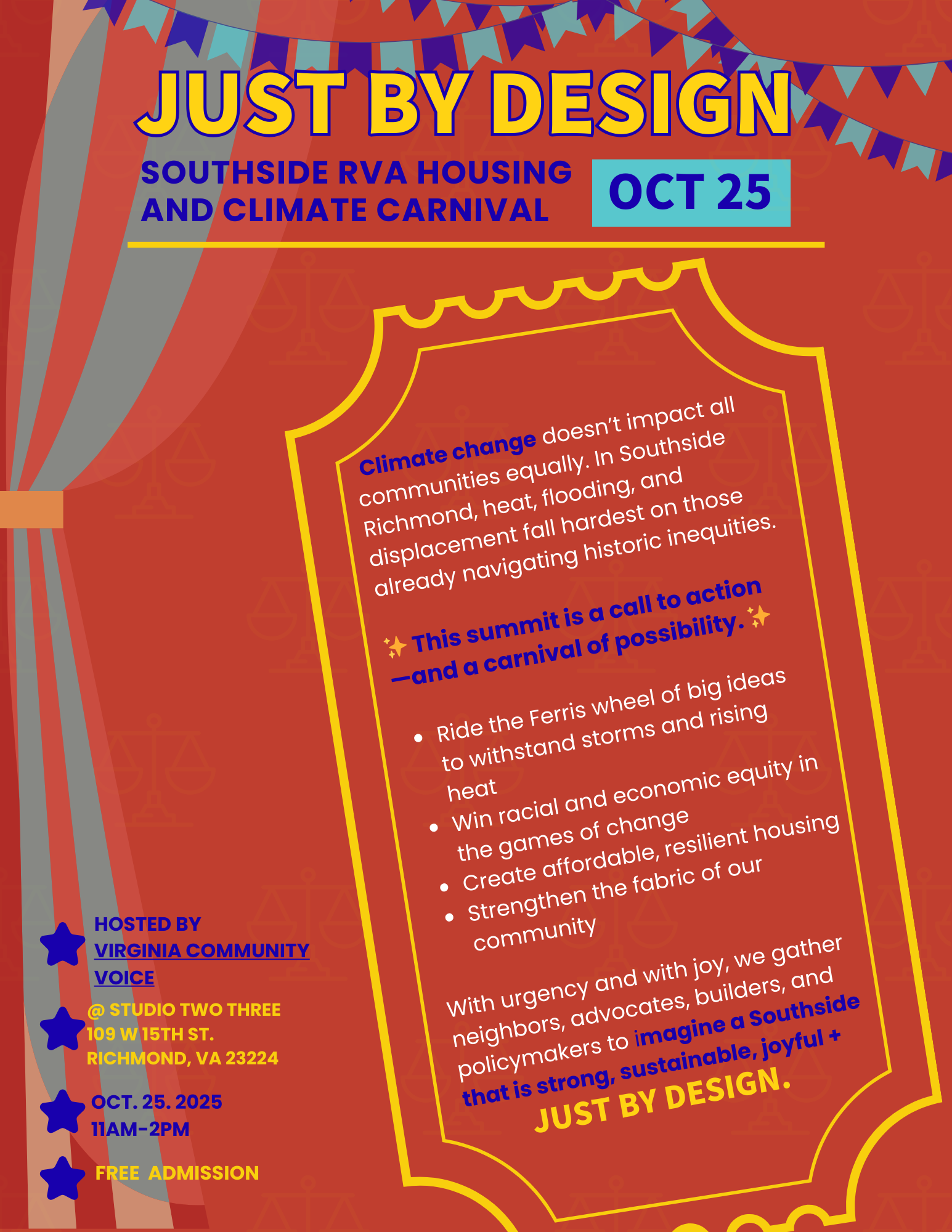 This community carnival is a call to action. Its purpose is to imagine a future that is not only sustainable, but just by design. We know climate change does not impact all communities equally. In Southside Richmond, the risks of heat, flooding, and displacement fall hardest on those already navigating historic inequities.